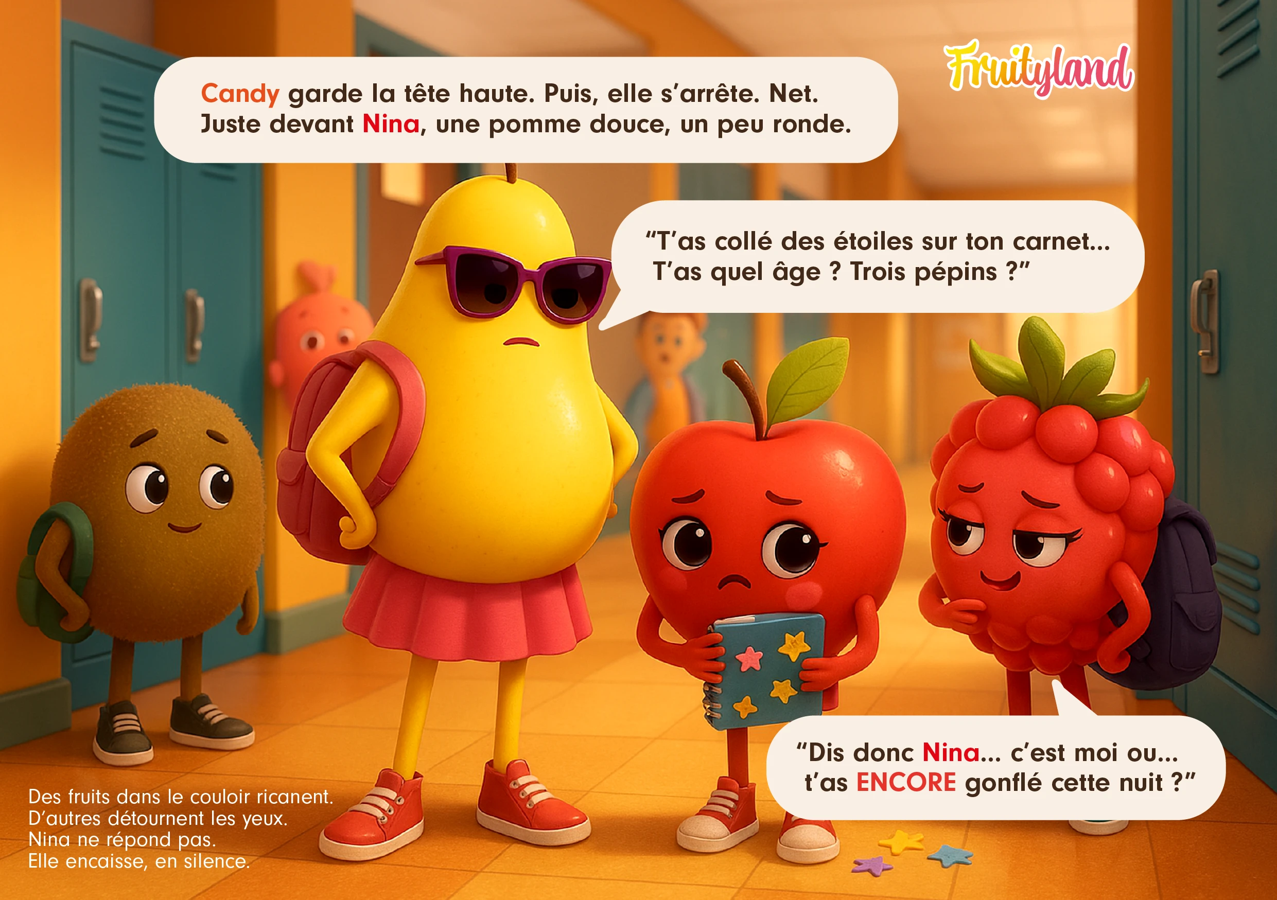 Plongez dans un univers pétillant et coloré où les fruits prennent vie, vont à l’école, et vivent des aventures aussi drôles qu’importantes ! Découvrez Candy la Poire, stylée mais taquine, Nina la Pomme, douce et attachante, et une foule de fruits attachants qui abordent avec humour et finesse des sujets essentiels comme le harcèlement, la différence et l’amitié.